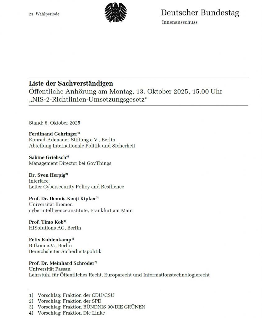 Weiter geht es mit #NIS2: Die Liste der Sachverständigen für die Anhörung im #Innenausschuss vom Deutschen #Bundestag am kommenden Montag, 13. Oktober 2025 um 15 Uhr für ein „NIS-2-Richtlinien-Umsetzungsgesetz“ wurde veröffentlicht.