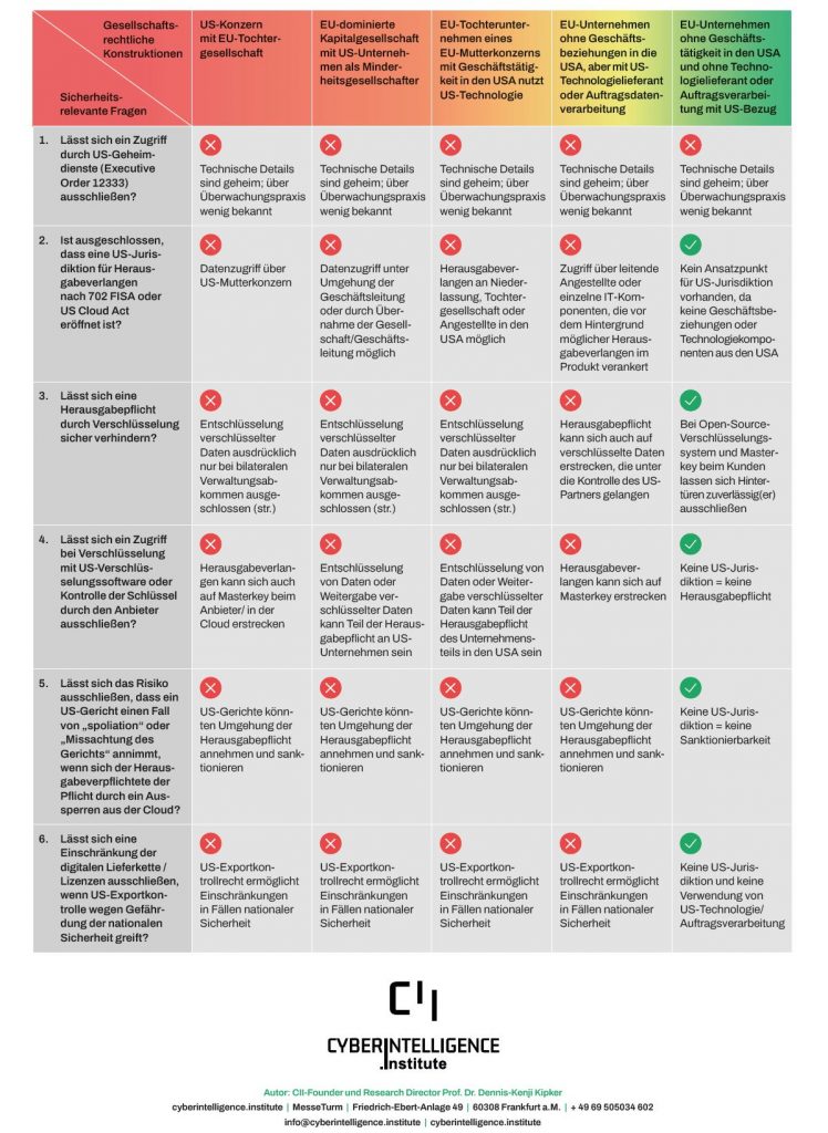 Denn nahezu sämtliche gesellschaftsrechtlichen Konstrukte, derer man sich seitens der großen internationalen Cloud-Konzerne bedient, lassen sich weder datensicher noch datenschutzkonform betreiben und sind damit digital unsouverän. Untersucht haben wir die Zugriffsmöglichkeiten nach der Executive Order 12333, Herausgabeverlangen nach 702 FISA, Cloud Act, die Blockade von Herausgabeersuchen durch Datenverschlüsselung, exportkontrollrechtliche Beschränkungen sowie das konzerneigene Aussperren aus der Cloud als technischer Verteidigungsmechanismus gegen unbefugte Datenzugriffe.