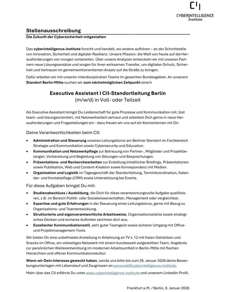 Weitere Details zur Stellenausschreibung gibt es auf der Website des #CII: https://cyberintelligence.institute/jobs/executive-assistant-cii-standortleitung-berlin-